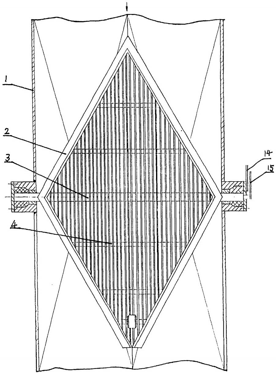 如圖1、2所示,凝汽器膠球清洗裝置收球網(wǎng)旋轉裝置,包括收球簡體1、柵格網(wǎng)板2、轉軸3、膠球引出口10、導流板7、傳動裝置和操縱裝置11,其收球簡體1為四棱,柵格網(wǎng)板2整體為菱形。所述收球網(wǎng)的旋轉裝置中,網(wǎng)板2上設有轉軸3,其柵格網(wǎng)板2的下面有支撐臂5,支撐臂5通過傳動裝置與收球筒體1外的操縱裝置11相連,其傳動裝置為螺桿傳動裝置,支撐臂5與位于橫螺桿8上的移動塊6鉸鏈,移動塊6與一同螺桿8平行的定位、導向導桿9相配合.