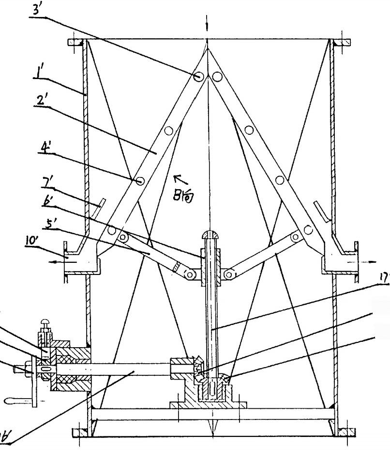如圖3、4所示,凝汽器膠球清洗裝置收球網(wǎng)旋轉裝置,包括收球簡體1,柵格網(wǎng)板2、轉軸3、膠球引出口10、導流板7、傳動裝置和操縱裝置11,其收球簡體1為四棱狀。本實用新型所述收球網(wǎng)的旋轉裝置中,每塊網(wǎng)板上各有一轉軸3,兩塊網(wǎng)板2對稱布置,柵格網(wǎng)板2的下面各有一支撐臂5,支撐臂5通過傳動裝置與收球簡體1外的操縱裝置11相連。傳動裝置為螺桿、齒輪傳動裝置,支撐臂S與位于縱螺桿17上的移動塊6鉸鏈,縱螺桿17下端的傘齒輪19°與動力傳動桿16上的傘齒輪18相嚙合。