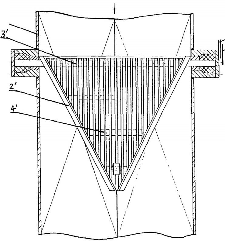 本凝汽器膠球清洗裝置收球網(wǎng)旋轉裝置中,操縱裝置為人工動力,其中設有棘輪12、12和棘爪13、13.適用于各種形狀的收球簡體,包括圓簡狀、棱柱筒狀等.通過操作操縱裝置,可使柵格網(wǎng)板轉到適當位置,從而完成其功能。當柵格網(wǎng)板將收球簡體的截面封住時(此時,菱形柵格網(wǎng)板呈傾斜面狀,而兩個三角形的柵格網(wǎng)板對稱形成A字形),則運行收球工況,膠球從引球口流出;當柵格網(wǎng)板轉到與水流平行時,便是柵格網(wǎng)板的自動清洗工況.