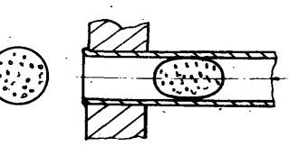 目前,凝汽器膠球清洗裝置的膠球廣泛采用的是軟膠球。這種膠球用天然橡膠或合成樹脂制作,質(zhì)地柔軟,富有彈性。由于膠球直徑比換熱管內(nèi)徑稍大,一般大約1~2mm,因此,冷卻水流的動(dòng)壓作用下,膠球進(jìn)入換熱管后被擠壓成橢圓形(圖1)。依靠膠球與管壁接觸環(huán)節(jié)的擦拭作用,將管壁上的污垢抹下來,并帶出冷卻管外。由于是整圈的擦抹,也把停留在管壁上的靜止水膜破環(huán),從而提高了管子的傳熱效能。