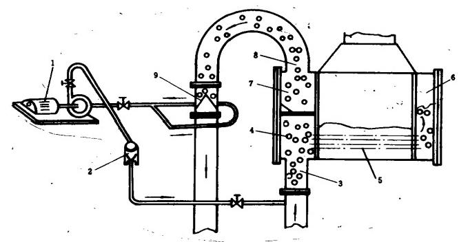 1一膠球泵2—裝球室3—冷卻水進(jìn)口4—膠球室5—換熱管·6—凝汽器后水室7—凝汽器前水室8—冷卻水出口9一收球網(wǎng)