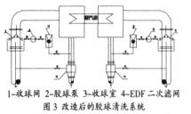 EDF型二次濾網(wǎng)的網(wǎng)芯為錐面,錐面被隔板等分為12個單元。當濾網(wǎng)臟污時,排污箱擋住一個單元的進水側(cè),排污箱、隔板、1個單元構(gòu)成1個密閉腔室,打開排污門時網(wǎng)芯出水側(cè)與排污管形成較大的壓降,從而將網(wǎng)芯內(nèi)表面的垃圾沖洗到循環(huán)水出水管。排污箱旋轉(zhuǎn)一周整個濾網(wǎng)就反沖洗一次。改造后的膠球清洗裝置凝汽器海綿清洗系統(tǒng)見圖3。