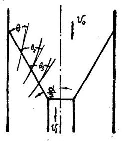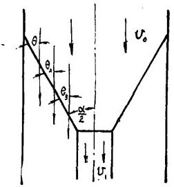 (1)進(jìn)入下方箱的中心部分流體(以下簡稱中心部分流體)既不加速也不減速,其余部分流體亦不發(fā)生變化。對于無粘性流體,此時V?=V。。在這種情況下流線不發(fā)生任何變化:仍為平行直流線。各處流線與收球網(wǎng)板的夾角均相等,等于網(wǎng)板與中心線的夾角(圖2),即式中α為收球網(wǎng)板的設(shè)計(jì)夾角。
