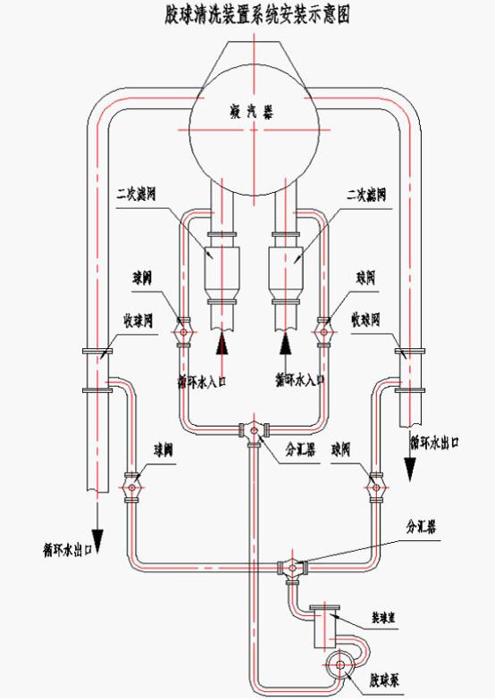 電廠凝汽器膠球清洗系統(tǒng)如圖所示。密度與水相近的海綿膠球(用天然橡膠或合成樹脂制成)裝入球室后,啟動膠球泵可以將膠球用比循環(huán)水壓力高的水流送入凝汽器水室。膠球直徑雖比銅管內徑大1~2mm,但因是多孔柔軟的彈性體,很容易被水流帶入銅管,并被壓縮成卵形。膠球在行進過程中抹去管壁上的污垢,流出管壁時,依靠自身的彈力彈掉表面的污垢,并隨循環(huán)水流入收球室,然后被膠球泵重新送入凝汽器。
