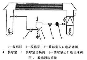 裝球室加裝逆止門前后運行程序的比較目前安裝在電廠中的膠球清洗系統(tǒng)(最一常用于50MW以上機組的單循環(huán)制系統(tǒng))其系統(tǒng)見圖1。