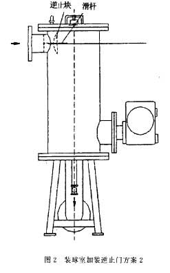 A)考慮以下3種方案:在原系統(tǒng)管路中裝球室入口處增加能夠實現(xiàn)逆止功能的止回閥。根據(jù)系統(tǒng)壓力及膠球循環(huán)管路通徑,可選用H44)-6型旋啟式止回閥。其優(yōu)點是:不需要對現(xiàn)有裝球室做任何改動,巳逆止效果好,但缺點是增加了系統(tǒng)中的閥門,成本增加較多,而且因閥門安裝在系統(tǒng)管路上,不能將膠球完全阻隔于裝球室內(nèi)。