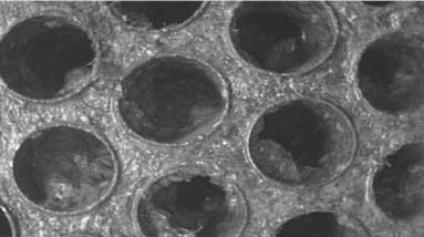 凝汽器膠球清洗裝置中前7效清洗時(shí),首先采用酸洗,以除去硫酸鈣以外的大部分水垢,考慮到銅鋁合金管壁較薄,且垢層厚薄不均勻,需要選擇腐蝕性小,又有較好的清洗效果的酸性清洗劑,所以酸洗清洗劑選擇氨基磺酸。其后采用中性清洗劑進(jìn)行螯合清洗,該清洗劑主要包含螯合劑、表面活性劑、聚合物,對(duì)垢表面潤(rùn)濕、滲透,改變垢晶體結(jié)構(gòu),使垢膨化疏松,便于通過水流攜帶出系統(tǒng)。前7效采用蒸發(fā)器自身的循環(huán)系統(tǒng)進(jìn)行清洗。首先在循環(huán)清洗液中加入銅緩蝕劑,由于銅緩蝕劑呈堿性,所以循環(huán)清洗液呈堿性。隨后不斷地向系統(tǒng)中注入淡化水,以增大循環(huán)水量,由于淡化水呈弱酸性,所以循環(huán)清洗液pH值逐漸降低,直至接近淡化水的pH值(約6左右)。此時(shí)階段循環(huán)清洗液中的總硬較平穩(wěn),在200mg/L左右。第230min時(shí),開始向系統(tǒng)中注入710清洗劑,由于710清洗劑是一種復(fù)合型有機(jī)酸類清洗劑,清洗機(jī)理主要是通過與無機(jī)鹽、金屬氧化物等形成螯合物。故在加入710后,其首先與清洗液中的鈣離子反應(yīng),使清洗液中的鈣離子逐漸降低,直至為零。第320min時(shí),開始向系統(tǒng)中注入氨基磺酸,pH值迅速下降,第375min時(shí),降低至1.5,停止注酸。隨著氨基磺酸的注入,碳酸鈣垢開始分解,清洗液中的Ca2+濃度迅速增大,由于碳酸鈣垢分解消耗了大量的酸,pH值也迅速上升。第400min時(shí),清洗液中的總硬達(dá)到1150mg/L,pH值上升至4.5,并再次向系統(tǒng)中注入氨基磺酸。隨著酸的注入,pH值再次迅速下降,總硬繼續(xù)上升。第415min時(shí),pH值下降至1.5,停止注酸。第435min時(shí),總硬1450mg/L,pH值略上升至1.7,此后,總硬、pH值相對(duì)平穩(wěn),說明清洗終點(diǎn)到達(dá),停止酸洗。酸洗前后的結(jié)垢情況,見圖4、圖5。