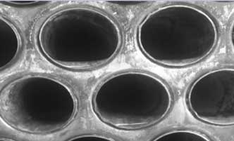 1)蒸發(fā)器前7效(尤其第1效)上部銅管表面附著有一層均勻的水垢沉積物,見圖1,厚度約0.5mm,底部銅管表面附著一層較厚的硬質(zhì)水垢沉積物,部分區(qū)域形成水垢掛體并塞滿換熱管縫隙,不銹鋼內(nèi)壁附著一層水垢掛體,部分區(qū)域厚度達(dá)到10mm,垢樣分析主要成分為硫酸鈣,并有部分碳酸鈣;