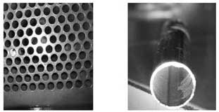 1)現(xiàn)場檢查情況見圖,其中的凝汽器的TP304不銹鋼管內(nèi)壁結(jié)垢普遍,呈深灰褐色,個(gè)別管結(jié)垢呈淺藍(lán)色或褐黃色;對凝汽器換管隨機(jī)割管,管內(nèi)水垢分兩層結(jié)垢,外層疏松易脫落;內(nèi)層結(jié)垢緊密,質(zhì)地堅(jiān)硬,內(nèi)層水垢呈灰白色;