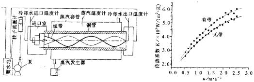 進行了銅管內(nèi)安裝冷凝器自動膠球清洗裝置前后的傳熱系數(shù)對比試驗,試驗系統(tǒng)如圖2所示。用水泵抽出水池中的冷卻水,經(jīng)過轉(zhuǎn)子流量計測出流量后,進入冷凝銅管帶動管內(nèi)的螺旋冷凝器自動膠球清洗裝置旋轉(zhuǎn);冷卻水的進出口溫度由精密溫度計測出;銅管外加熱蒸汽由40kW的蒸汽發(fā)生器供給。改變冷卻水的流速,測出冷凝銅管內(nèi)安裝冷凝器自動膠球清洗裝置前后兩種工況下的傳熱系數(shù)。對比試驗的結(jié)果如圖3曲線所示。