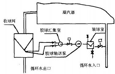 膠球清洗,凝汽器膠球清洗裝置系統(tǒng)由膠球泵、裝球室、分匯器、收球網(wǎng)及閥門等組成。它的工作原理是:清洗球在水流壓力的作用下,從冷卻水系統(tǒng)的進水管進入凝汽器的冷凝水管,洗擦掉管內壁的污垢,清洗球流至冷卻水系統(tǒng)的出口,通過一個篩板裝置,將清洗球從冷卻水里篩濾出來。篩濾出的清洗球由一臺回收泵抽走,然后按自動化要求程度的不同,通過一個清洗球自動篩選器或者一個閘板式清洗球收集器,再由泵送到冷卻水系統(tǒng)的人口,如圖1所示。